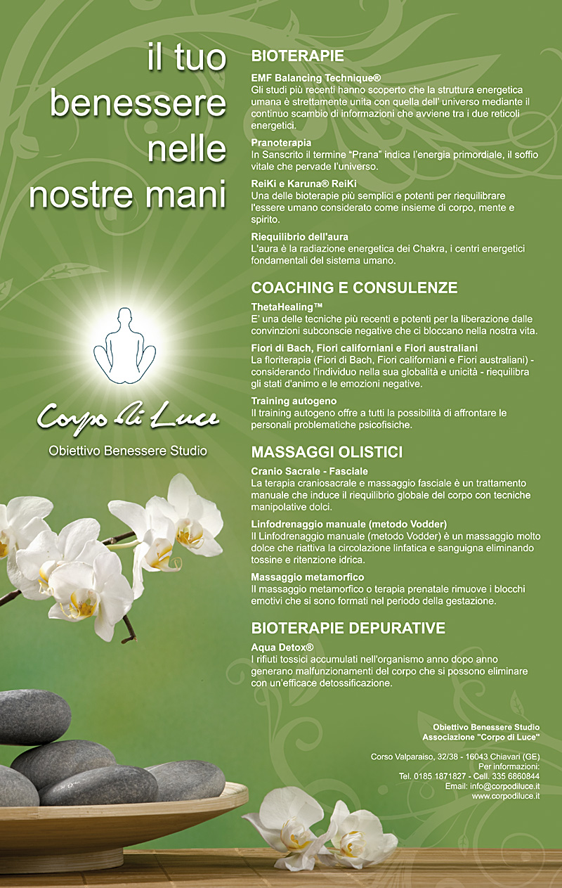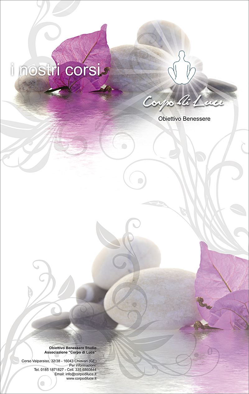 Per il centro benessere Corpo di Luce sono stati realizzati poster informativi su corsi e terapie, mantenendo unità visiva con le pagine web e l’immagine aziendale messa a punto durante la presentazione del sito internet.